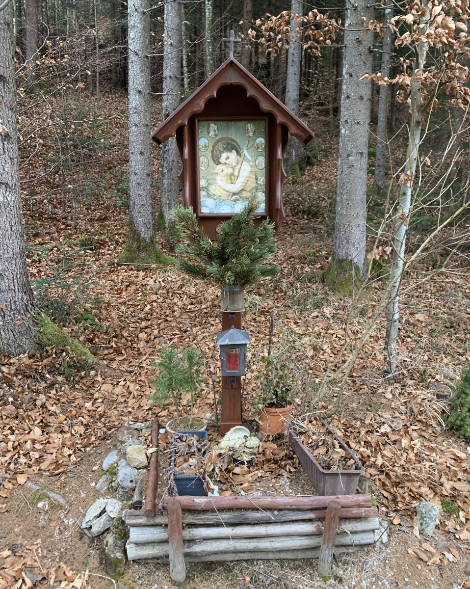 Das Kreuz steht neben einer Forststraße am Waldrand. Es wurde in Gedenken an die Fam. Brandl errichtet.