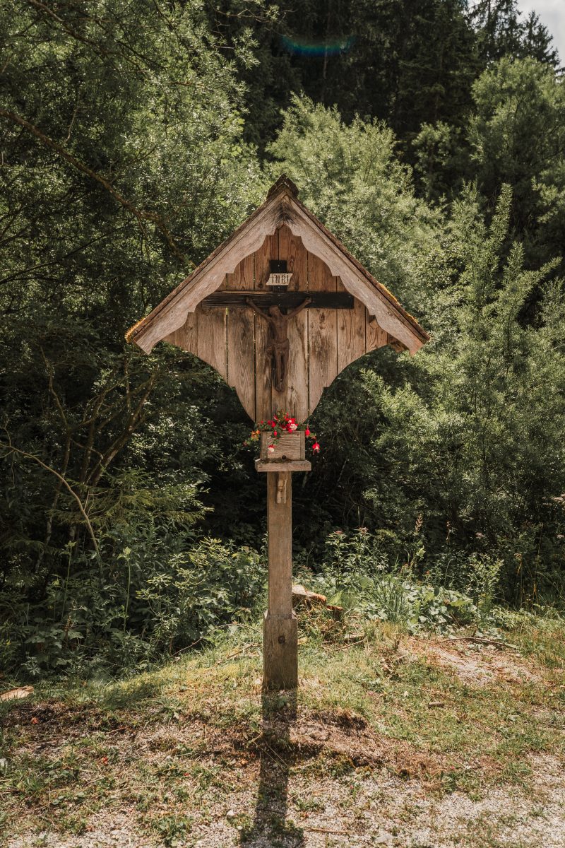 Es handelt sich um ein Holzmarterl mit gusseisernen Jesus am Kreuz. Es