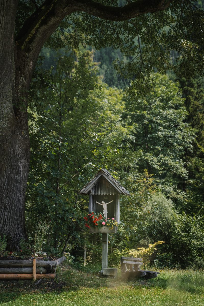Flurkreuze sind christliche Wegzeichen aus Holz, Stein oder Metall an Wegen und Feldern. Viele christliche Flurdenkmäler stehen neben Kastanien, Eichen oder wie hier einer Winterlinde – die in diesem Fall ein geschütztes Naturdenkmal ist.