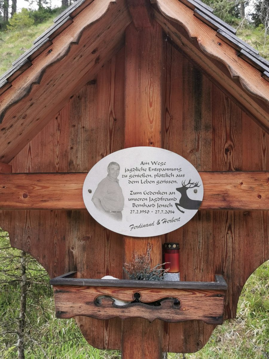 Das Kreuz ist Herrn Jensch gewidmet, der bei der Jagd mit Hochstand umgestürzt ist und verstarb. *27.2.1950 bis +27.7.2014