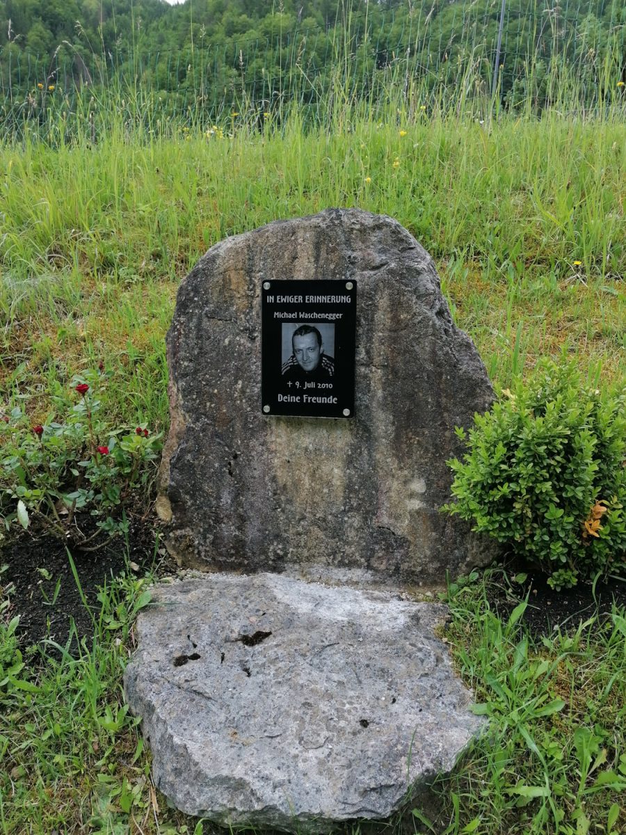 Der Gedenkstein befindet sich an der Landesstraße L714 (Salzastraße) nahe dem ehemaligen Gasthaus Grill und dem Campingplatz Palfau. Er wurde errichtet zur Erinnerung an Michael Waschenegger aus Palfau, der am 9. Juli 2010 im Alter von 26 Jahren bei einem tragischen Verkehrsunfall ums Leben kam. Beim Linksabbiegen mit seinem Moped wurde er von einer nachkommenden Autofahrerin übersehen und tödlich verletzt.