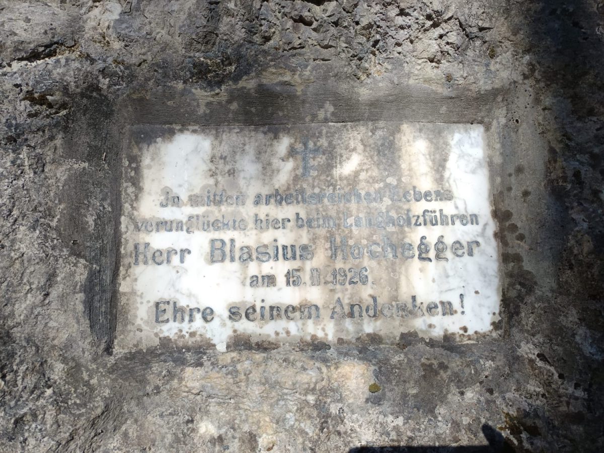 Dieses Marterl erinnert an Blasius Hochegger, der am 15. Februar 1926 gegenüber der Rochuskapelle beim Langholzführen tödlich verunglückte. Damals führte die alte Straße noch außen, auf der Ennsseite, um den Felsen herum. Die Information stammt von Sepp Frois.
