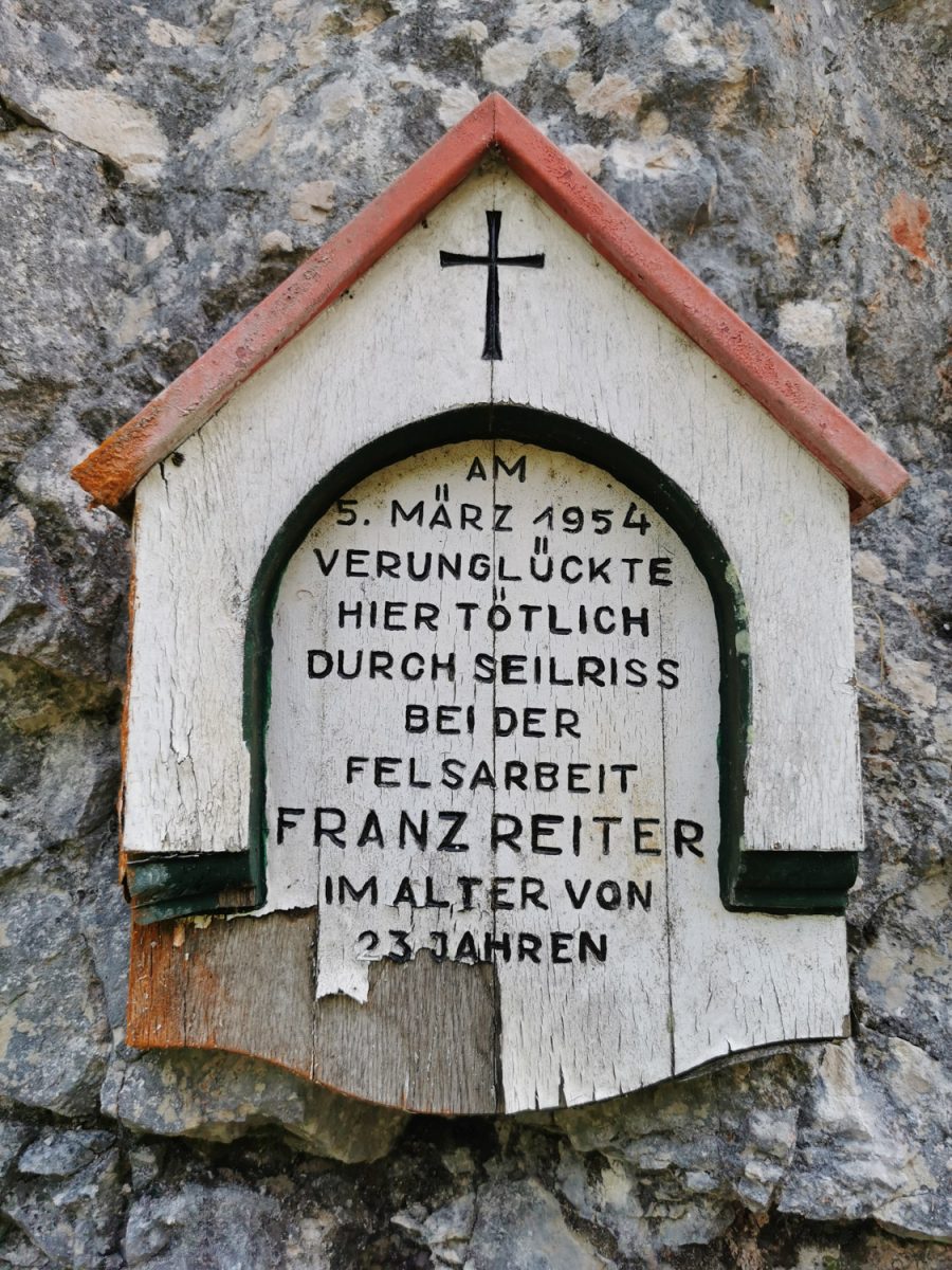 Auf der holzernen Gedenktafel ist geschrieben: Am 05. März 1954 verunglückte hier tötlich durch Seilriss bei der Felsarbeit Franz Reiter im Alter von 23 Jahren.