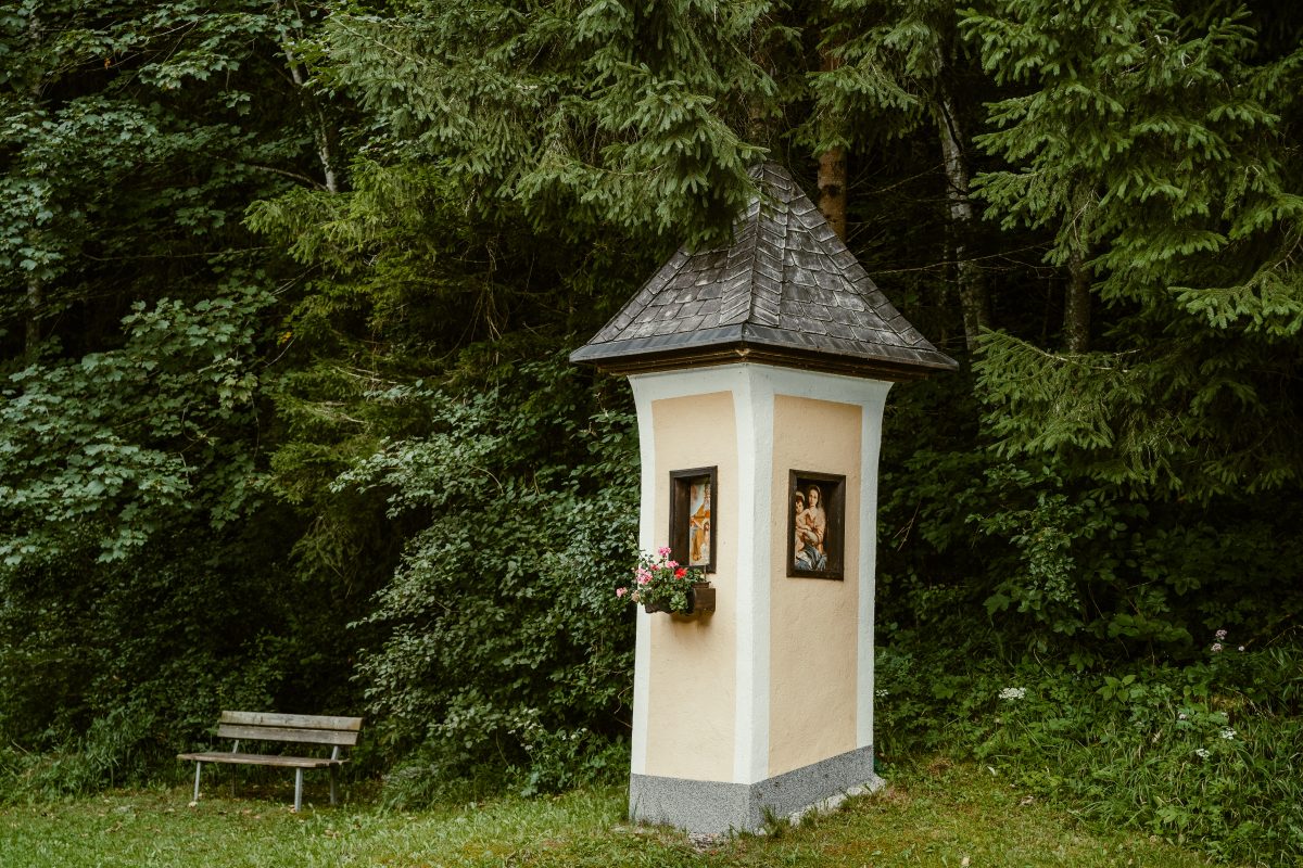 Das Grubbauernkreuz ist ein gemauerter Bildstock mit grauem Sockel. Die vier Wände sind beige-orange verputzt und weiß eingefasst. Auf drei Seiten befinden sich holzeingefasste Nischen mit Heiligenbildern: