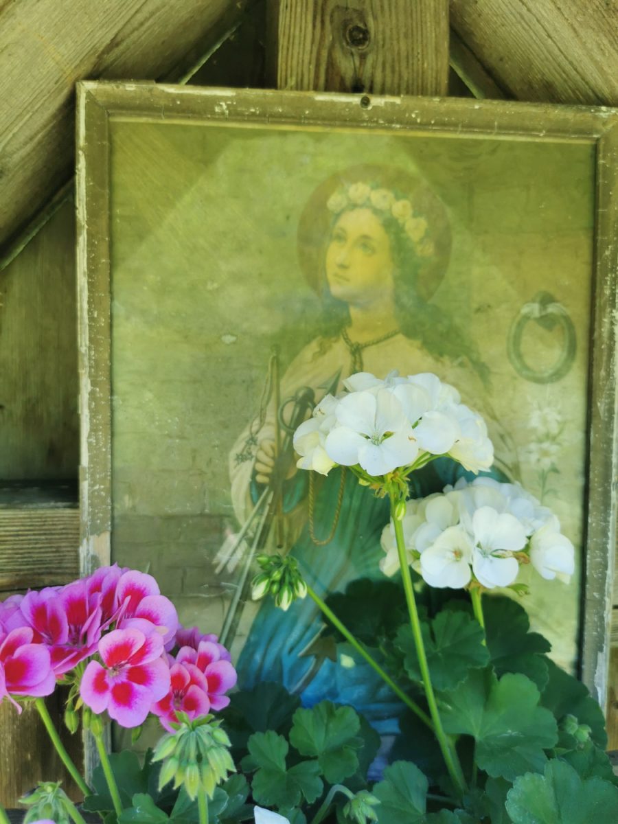 Dieses Kreuz steht beim Huberhof. Die Merkmale des Bildes deuten auf die Hl. Dorothea hin.