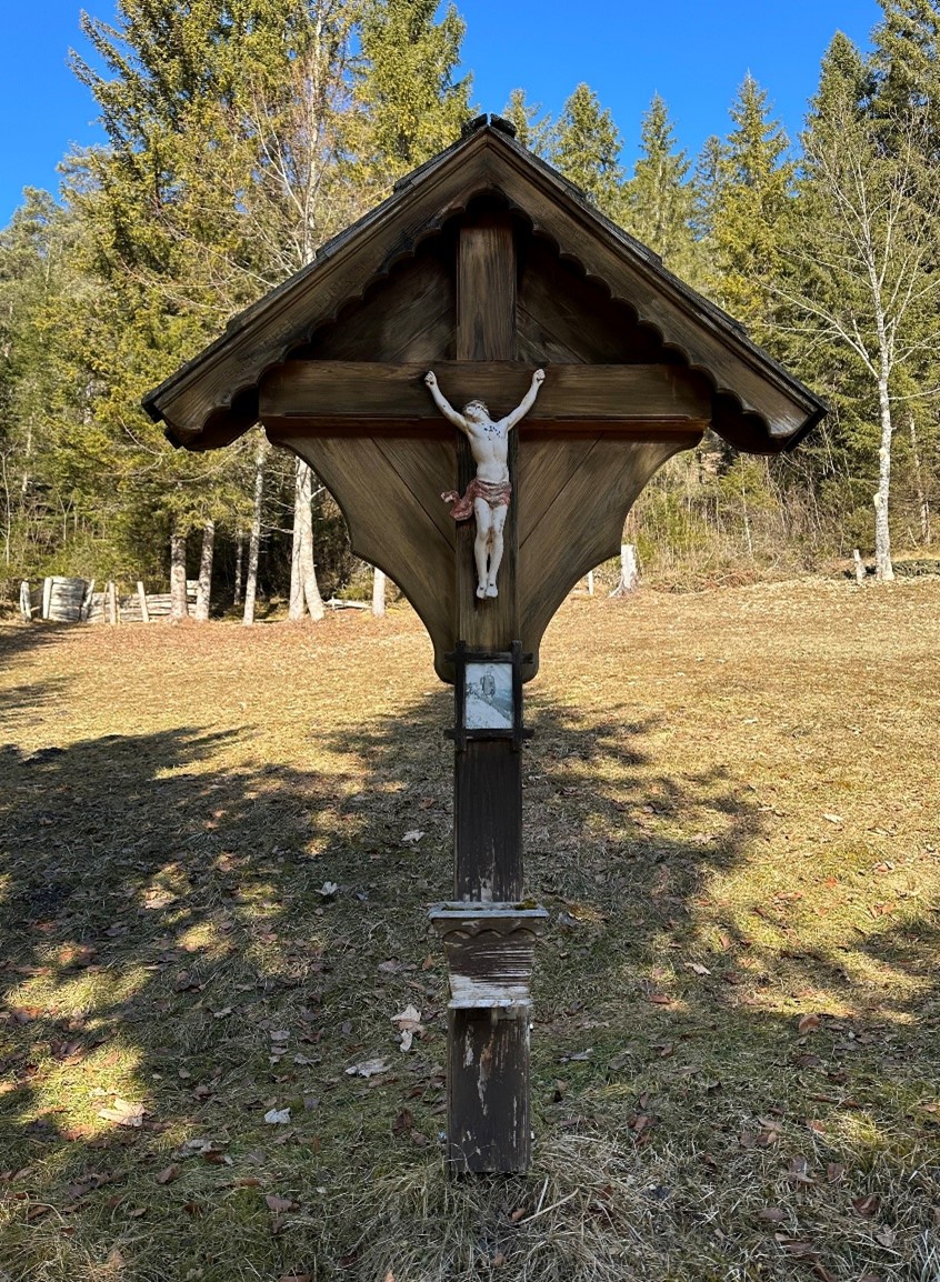 Es zeigt Jesus am Kreuz. Es wurde zum Gedenken an Hr. Lindner Viktor - verstorben 1983 - neu errichtet.