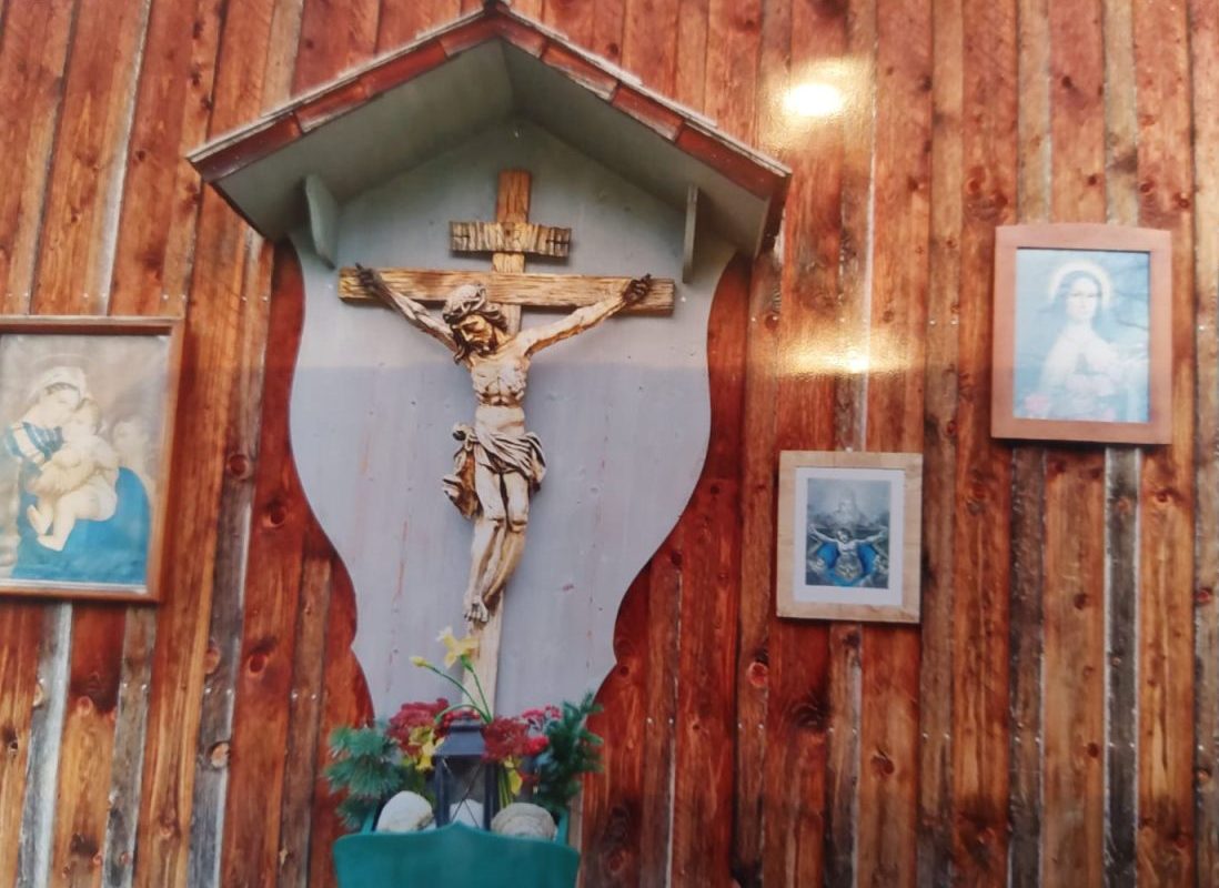 Hochreiters Hittn Kreuz. Die Hüte ist 2011 gebaut worden. Viele wertvolle Hände haben geholfen. Der heilige Sebastian ist Annelieses Schutzheiliger. Das Kreuz bietet uns Schutz und Segn. Ausdrucksvolle Bilder zieren die Bretterwand. Mutter Maria mit Kind, Heilige Dreifaltigkeit und Theresia von Lisieux. Auf der Hinterseite der Hütte sehen wir ein Bild. Es zeigt die Rückseite des Lugauers. 2 Pferde ziehen das Holz ein Bacherl fließt munter danebne. Wir schätzen unser Hittn Kreuz und sagen danke.
