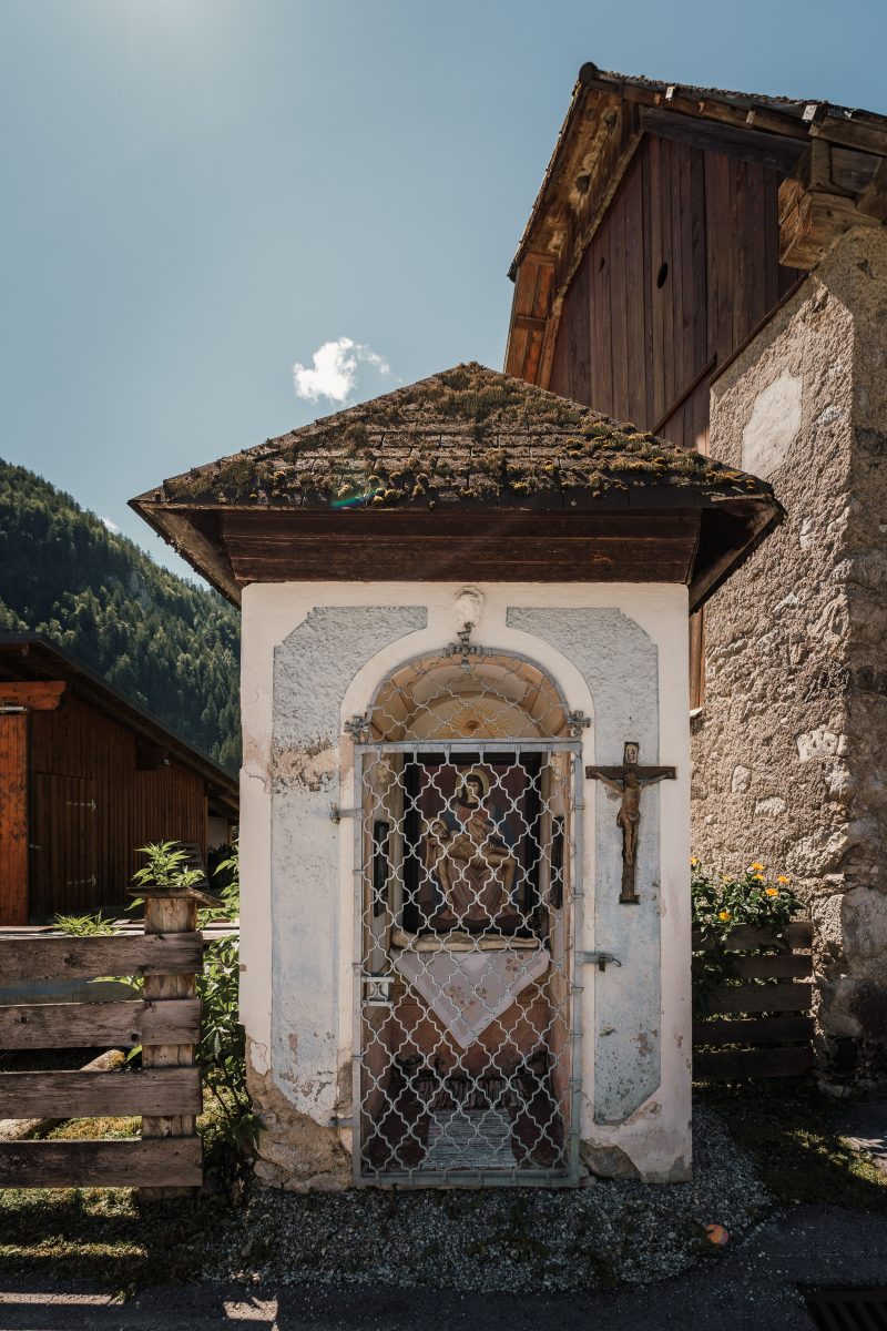 Im Inneren zeigt sich eine schmerzhafte Muttergottes mit dem toten Jesus, ergänzt durch Darstellungen des liegenden Christus. Die Wände sind mit Malereien geschmückt: das Auge Gottes, Heiligenbilder und zarte Engelskopffresken verleihen dem Raum eine spirituelle Tiefe. Außen befindet sich ein altes Holzkreuz mit dem Gekreuzigten sowie ein Fresko, das Jesus darstellt – ein Ort, der von Glauben und Geschichte erzählt.