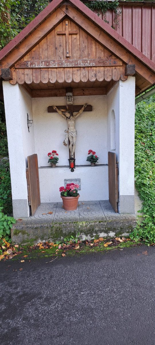 Vorher stand hier ein frei stehendes Kreuz mit einem großen, ganz aus Holz gefertigten Christus am Kreuz, jeder Witterung u. Dieben ausgesetzt!!!