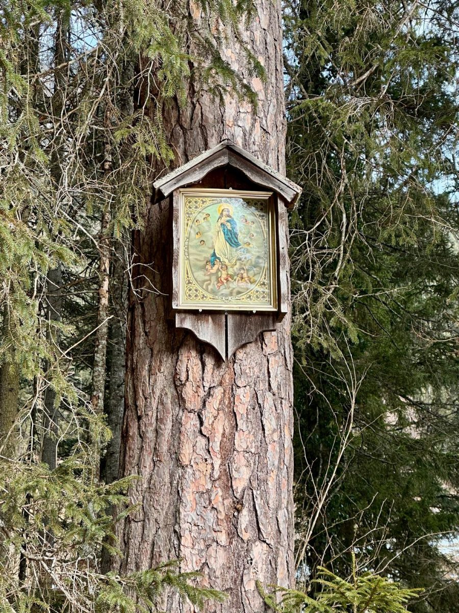 Dieses Baumbild stammte ursprünglich vom ehemaligen Anwesen Saml. Vermutlich einst Teil einer Wegandacht auf der Goss in Richtung Gams. Bild zeigt Maria, umgeben von Engeln und Wolken