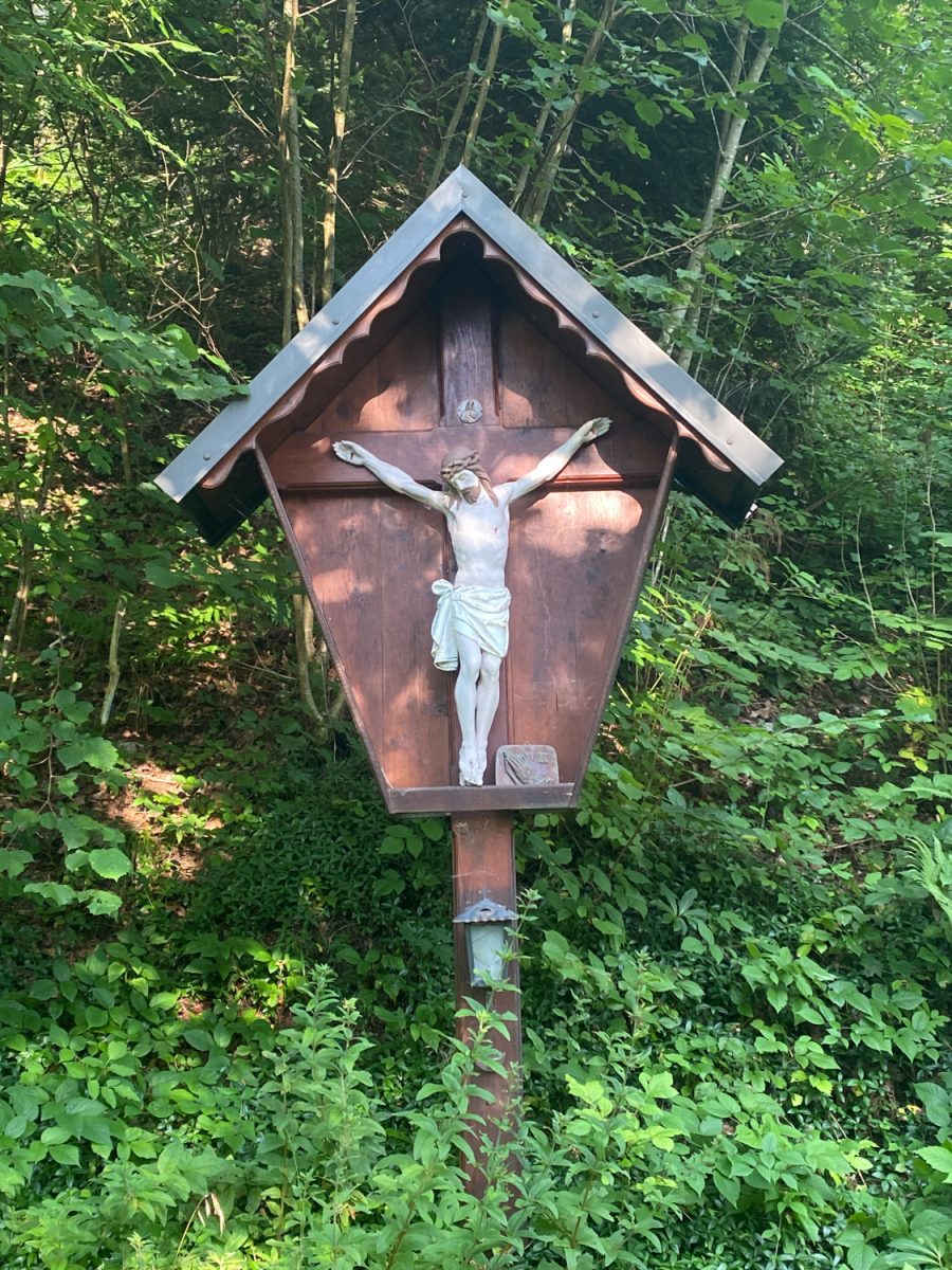 Eine Dirn vom Michlberger (Großmann, vulgo Fischer – Michlberger) wurde von den Krampussen arg drangsaliert und in den Brunntrog eingetaucht, war komplett nass und aus dem Haus geschleppt, mitgenommen hinunter wo heute das Kreuz steht, wo sie erfror/ oder an einer nachfolgenden Lungenentzündung/ oder an der „Froas“ (Fraisen – Epilepsie) starb. Hermi Großmann erzählt, dass Markus Fischer (geboren 1925 und schon verstorben) immer erzählte, er weiß es schon von seinen Großeltern, es muss daher im 19. Jhdt. gewesen sein. Meine verst.Großmutter Maria Grossmann, geb. 1909 wusste es auch aus Erzählungen. So wie das Marterl jetzt ausschaut mit dem großen Herrgott drinnen, war es nicht immer. Der Herrgott stammt aus dem Vorhaus Michlberger. Pater Martin hat das Kreuz eingeweiht, vorher wurde es mutwillig stark beschädigt durch Steinwürfe zwischen 1965 und 1970. Die Missetäter wurden ausgeforscht und mussten mithelfen, das Kreuz wieder herzurichten. Es war geschmückt mit einem Bild – aber leider keine genauen Angaben, eine Blumenvase zum Einfrischen für Blumen, später dann ein Blumenkistl und eine Laterne für Lichterl.