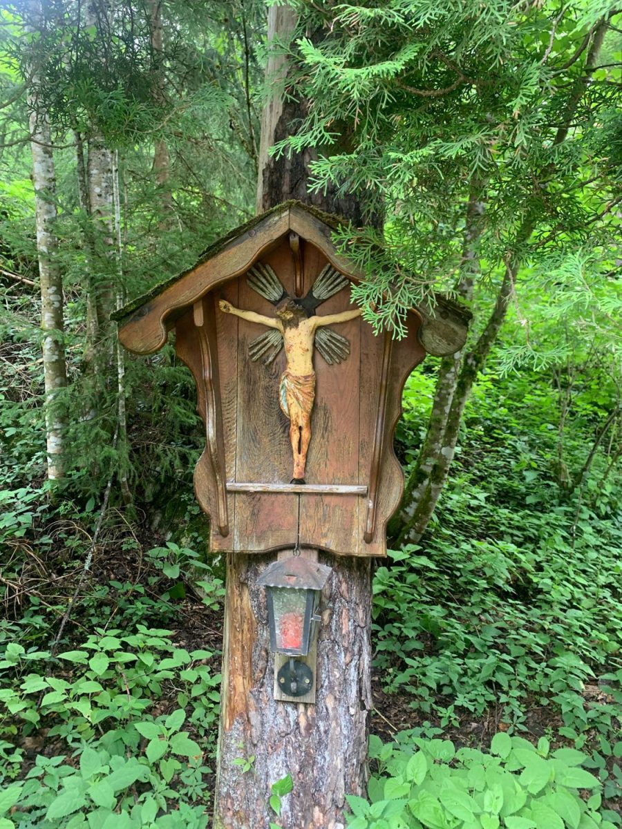 Dieses Kreuz stand umrahmt von einer Dujien Hecke gegenüber vom alten GH Wahrheit. Seit 2024 steht es dort nicht mehr. Vermutlich war der Holzpflock morsch.